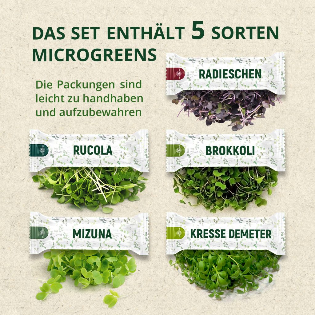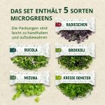 - Set inklusive 5 Samenpäckchen: Brokkoli, Kresse, Mizuna, Radieschen, Rucola